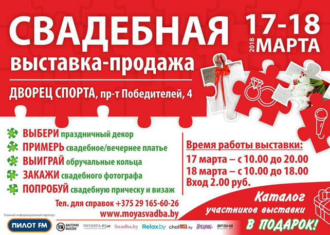 Международная специализированная выставка-продажа «Моя свадьба» проводится в Беларуси с 2012 года. В ней участвуют около 100 представителей свадебной индустрии. В этом году выставка состоится 17–18 марта по адресу: г. Минск, проспект Победителей, 4. Дворец Спорта – это большая и удобная площадка почти в центре города, куда легко добираться (рядом ст. м. Немига).